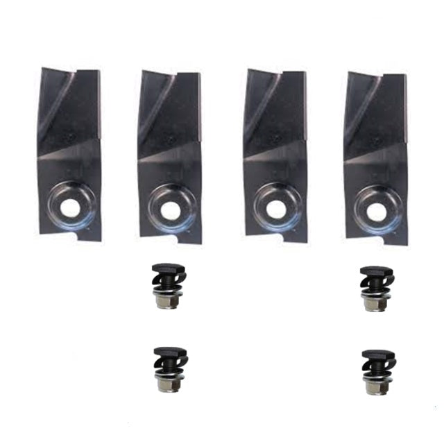 Blade & Bolt Set (1 pair per pack) JAK Max branded. Suits 19” (483mm) & 20” (508mm) Victa rear models. Including, Mustang, Twin and Supreme 500, Rambo, 500 and the 505 self propelled models. Flat blades. Domed bolt hole & formed flute blade.